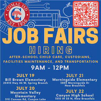 Comal ISD will be hosting job fairs this summer. The district is hiring for all positions. If youre interested in a job as a teacher substitute teacher office professional bus driver mechanic plumber or anything in between Comal ISD has opportunities for you.